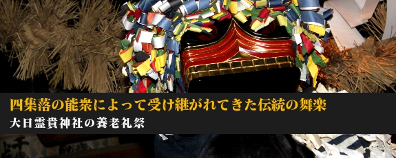 大日堂舞楽(養老礼祭)の起源は、元正天皇の養老二年(西暦718年)、天皇の勅令により大日堂(大日霊貴神社)が再建された際に、名僧行基とともに都から下向した楽人が舞った祝賀の舞楽が里人に伝えられたものと言われ、今日まで伝承されてきました。その年の国土の平安・五穀豊穣・無病息災などの祈りを込めて、毎年正月二日に奉納されています。